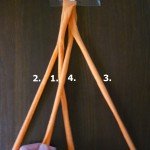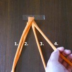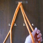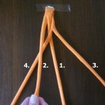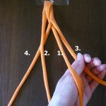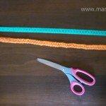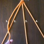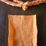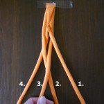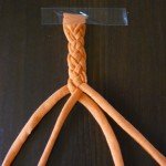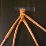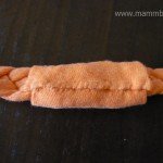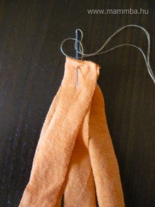 Észrevehetitek a pamut anyag sajátosságát, hogy ha nincs beszegve, akkor visszapöndörödnek a szélei. Ezt most ki is használjuk. Helyezzétek a 4 felvágott csík egyik végeit egymásra, úgy, hogy a színük legyen felül (így befelé fog pöndörödni az anyag). Ezek után varrjátok össze néhány öltéssel, vagy ragasszátok oda ragasztópisztollyal. Ha kész, ragasszátok az asztalra, mert így nem fognak csúszkálni fonás közben.
