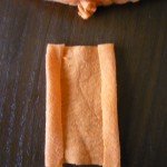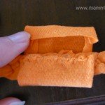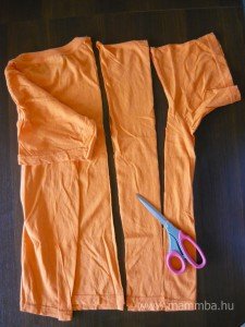 Vágjatok ki a pólóból egy kb. 6×10 cm-es téglalapot, melynek a két hosszanti szélét hajtsátok befelé.