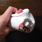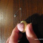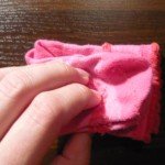 Az egyik hajgumit tekerjétek duplán az ujjatok hegyére, majd a másikat tekerjétek keresztbe szintén duplán az első gumira. Pici biztosítótűvel rögzítsétek a zoknitöltelék tetejére.