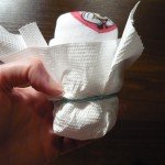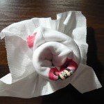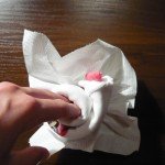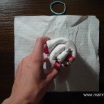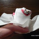3. Illesszétek a „tekercset” a négyzet alakú papírtörlő, vagy selyempapír/sütőpapír közepére és alulról rögzítsétek egy baba hajgumival/befőttes gumival.