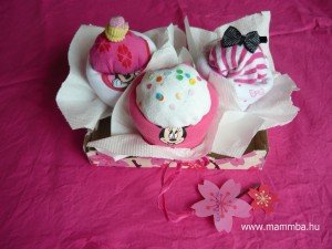 Kész az első muffin, a másik kettőt ugyanilyen módon kell elkészíteni, a babasapkát picire hajtogassátok és szintén gombafej formára formázzátok.