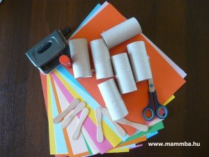 5. A WC-papír gurigák aljára csináljatok 2 lyukat, majd fűzzétek őket össze. Lehet karikával is rögzíteni, vagy szalaggal.