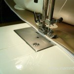 Balról jobbra haladjatok úgy, hogy a tűvel átszúrjátok az anyagokat a jelölés vonalán hátulról előre és a cérna áthúzása közben képződő hurkon keresztül kihúzzátok a tűt az anyagok tetején, majd jön a következő öltés hátulról beszúrva.)